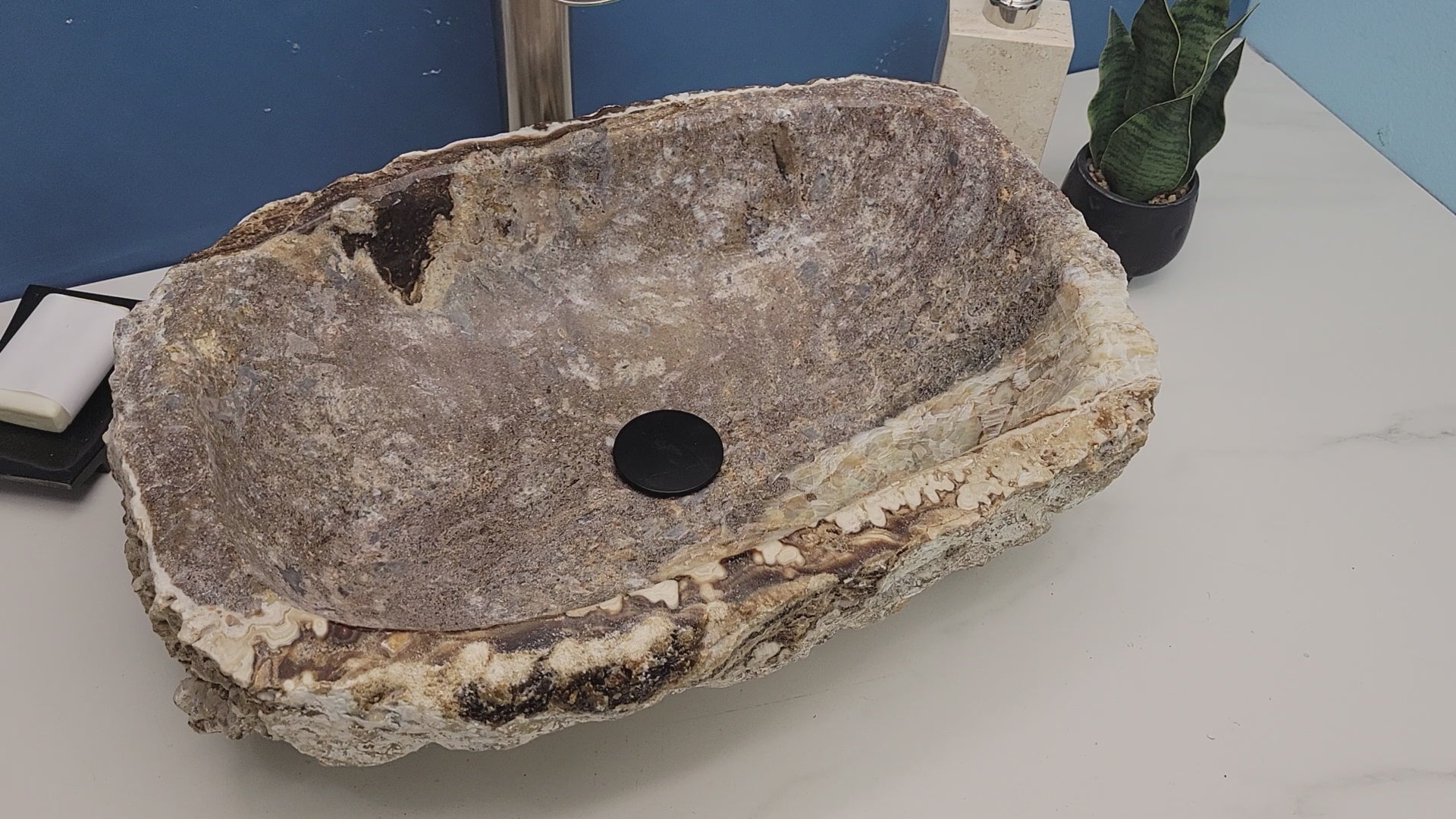 This sink is a natural work of art. It is hewn in elegant and natural stone that possesses unmatched color and texture. It will provide the perfect touch for your bathroom. The natural variation in lines and colors makes each sink unique. This Rustic Onyx sink is a statement of brown and tan and hewn rock accent perfect for your powder room, master bath, or guest accommodation. It has the look of petrified wood with the durability of Natural Stone. You will receive the exact sink pictured. It is truly one of a kind.