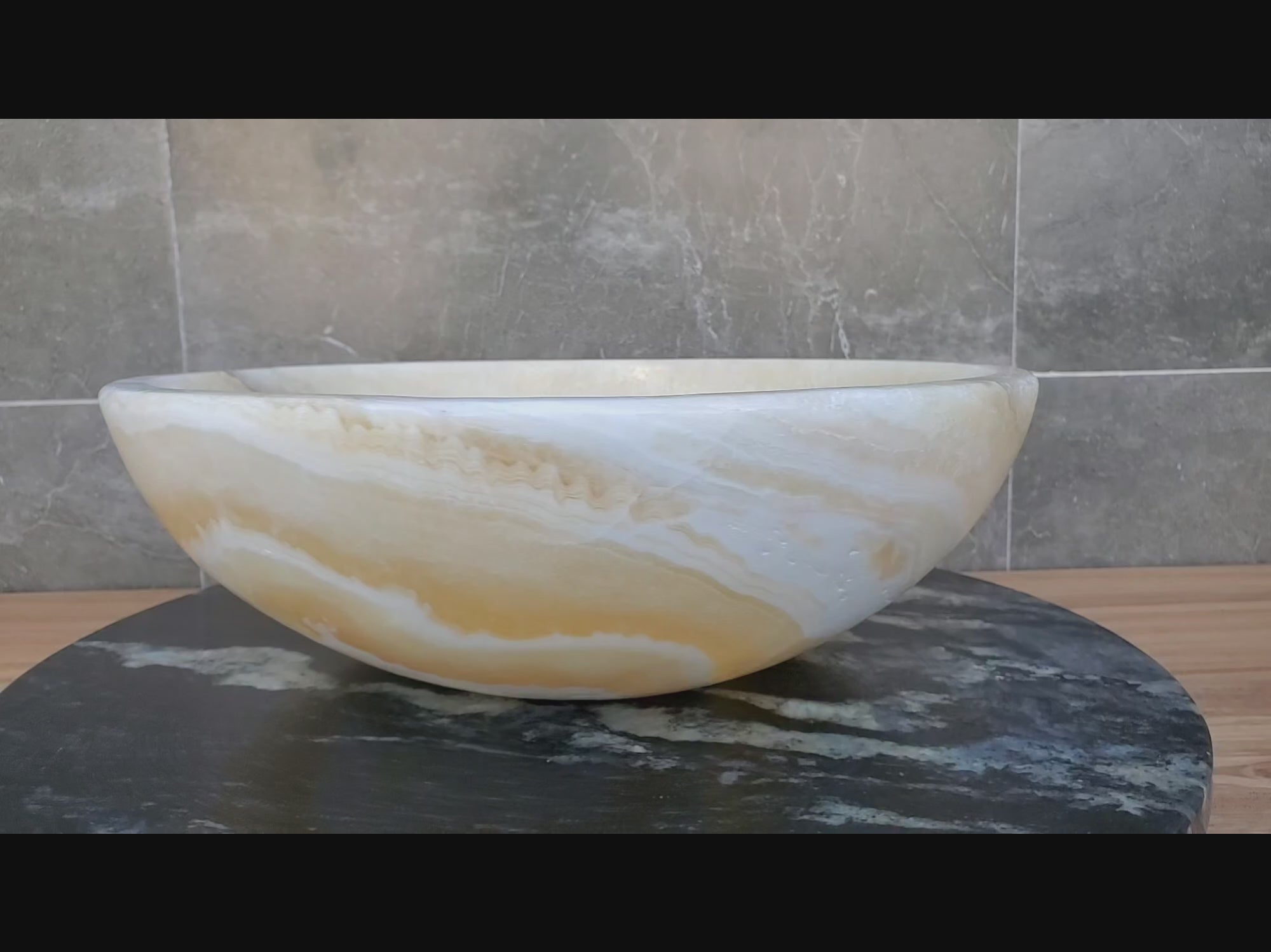 The Onyx Round Vessel Sink is a premium bathroom sink crafted from natural onyx stone, designed to enhance any bathroom's aesthetic. This above-counter bathroom sink boasts a sleek, round shape, offering a modern and sophisticated look. Upgrade your bathroom with this striking onyx stone sink for a bold and timeless addition to your home.