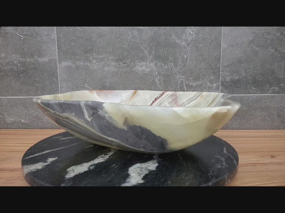 This green, gray, and umber stone handmade vessel sink is a work of art. Onyx is an elegant natural stone widely used for bathroom décor and finishes. Its unmatched color will provide the perfect contemporary finish for your project. The natural variation in lines, colors, and textures make this hand basin unique. You will receive the sink in this picture. It is truly one of a kind. Your purchase supports artisans in Central Mexico.