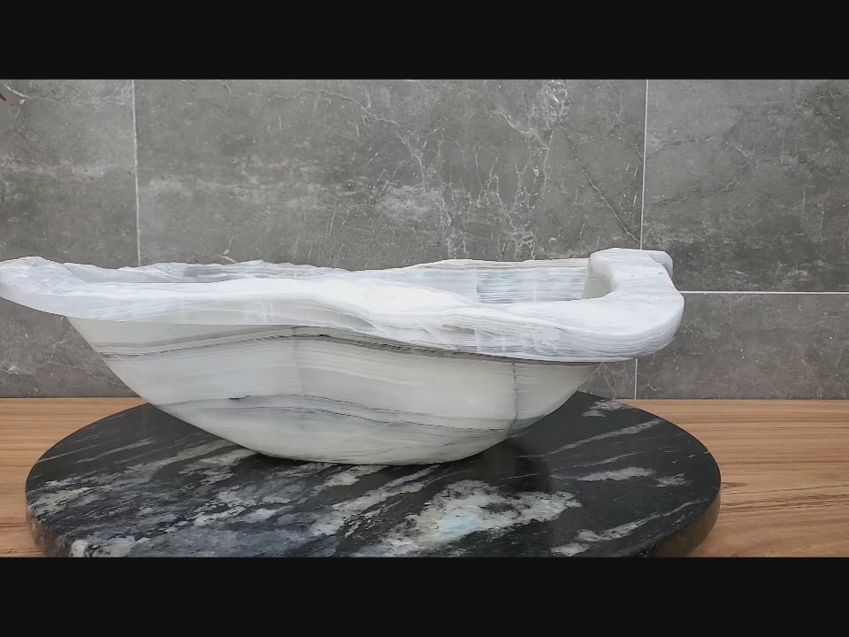 Elevate your bathroom with this Natural Onyx AquaVessel Sink, crafted from solid stone and uniquely shaped by nature. Each piece features organic veining and a smooth, hand-polished finish. Designed for countertop installation, this luxury basin adds timeless elegance, durability, and spa-like sophistication to any modern or upscale space.