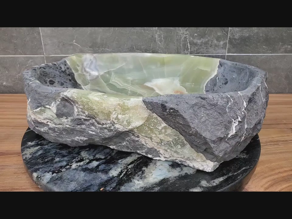 Elevate your bathroom with our stunning onyx vessel sink. This unique sink features a mesmerizing blend of green and gray, creating a luxurious and sophisticated focal point for your space. The natural patterns in the onyx ensure that each sink is one-of-a-kind, adding chic elegance and individuality to your bathroom decor. With its eye-catching design and high-quality craftsmanship, this vessel sink effortlessly combines functionality and aesthetic appeal, making it a stylish choice for any modern or traditional bathroom.