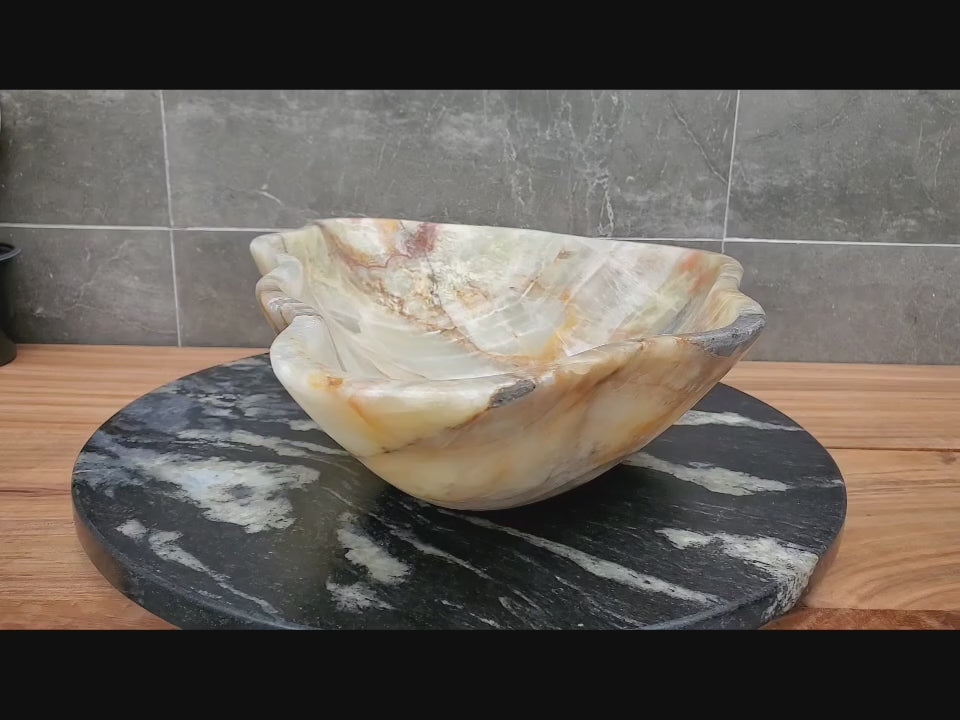 Elevate your bathroom with this Natural Onyx AquaVessel Sink, crafted from solid stone and uniquely shaped by nature. Each piece features organic veining and a smooth, hand-polished finish. Designed for countertop installation, this luxury basin adds timeless elegance, durability, and spa-like sophistication to any modern or upscale space.