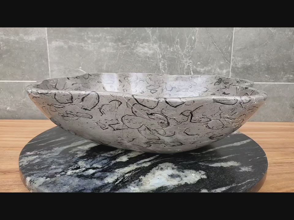 This sink is a natural work of art, handmade and carved in Central Mexico. Onyx & Marble are elegant and natural stones that possess unmatched colors. This sink features gray and black shell shaped patterns. It will provide the perfect touch for your bathroom. The natural variation in lines and colors makes this sink unique. You will receive the exact sink pictured. It is truly one of a kind.