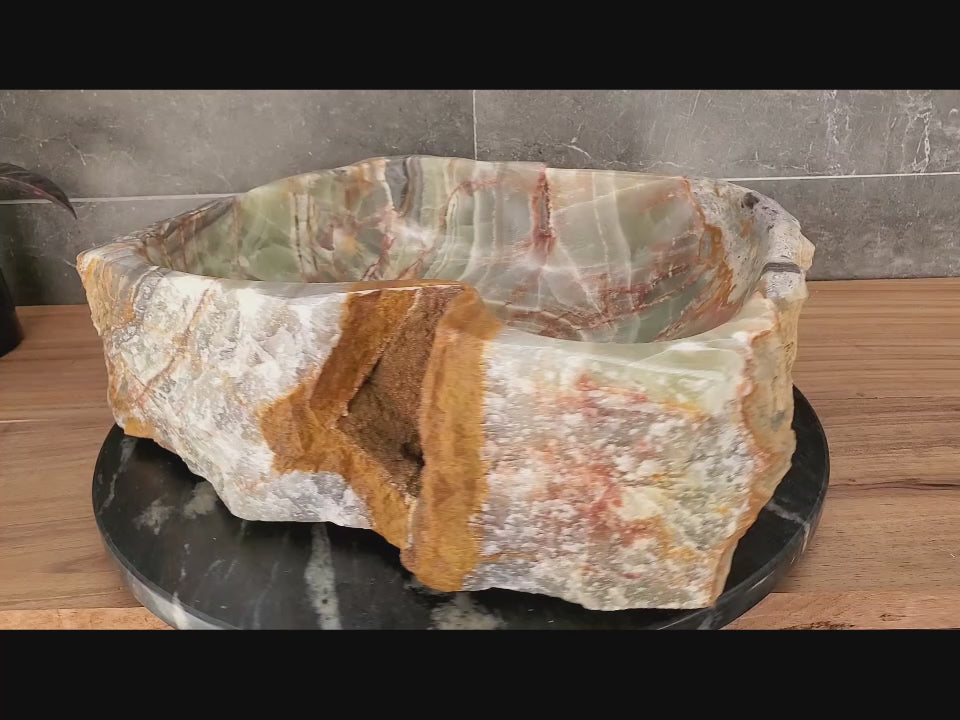 Bring warm, organic character into your bathroom with this handcrafted onyx stone vessel sink. Sculpted with a live edge finish and polished stone bowl, this one-of-a-kind piece features a distinctly rustic yet refined presence. The natural variation in lines, colors, and textures make each Felipe & Grace AquaVessel Sink unique.