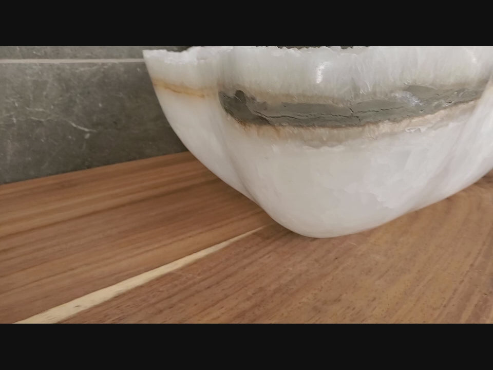 Make a statement with this one-of-a-kind white onyx vessel sink set. Handcrafted with distinctive translucent onyx accented with a honey-beige ring, this set adds a unique flair to any double vanity master bathroom. This an exclusive gift for modern contemporary homeowners who appreciate quality and style. You will receive the exact sinks in this picture. Your purchase supports artisans in Central Mexico.